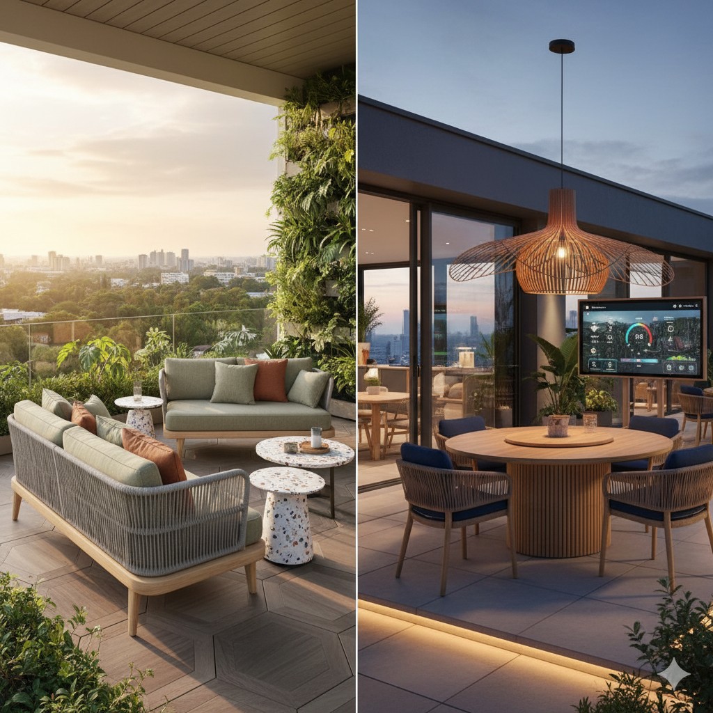 Una de las tendencias clave es la fusión entre lo indoor y lo outdoor. Según profesionales del diseño, los muebles de exterior están siendo diseñados con la misma sofisticación que los de sala interior, pero con materiales adecuados para la intemperie. Mueble de España+2Absolut Home+2Esto significa sofás lounge, sillones y mesas con tapicería resistente al agua, que parecen sacados de la sala, pero están hechos para soportar la humedad o el sol. Mueble de España Este enfoque permite que el balcón o terraza se convierta en una “habitación al aire libre” sin sacrificar estilo ni funcionalidad.