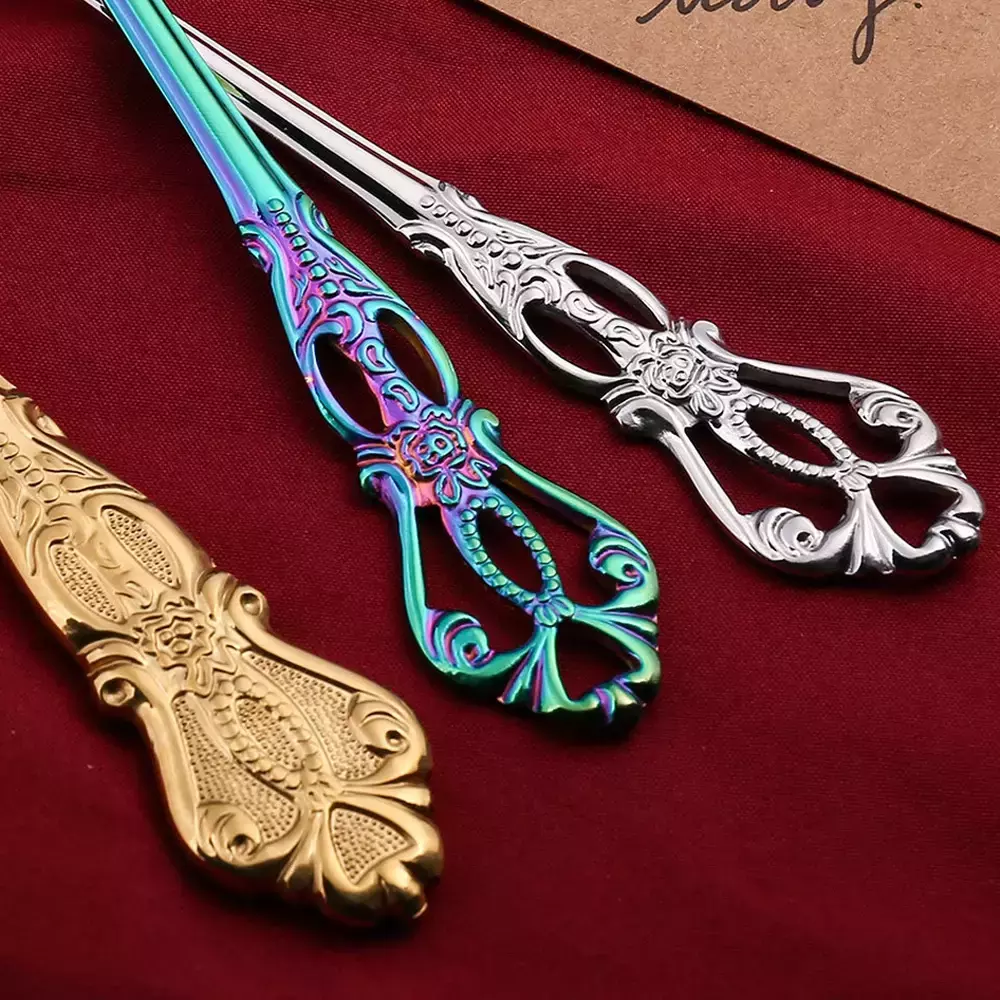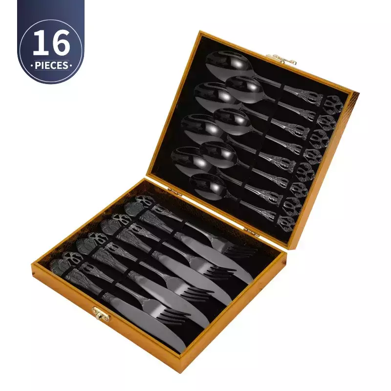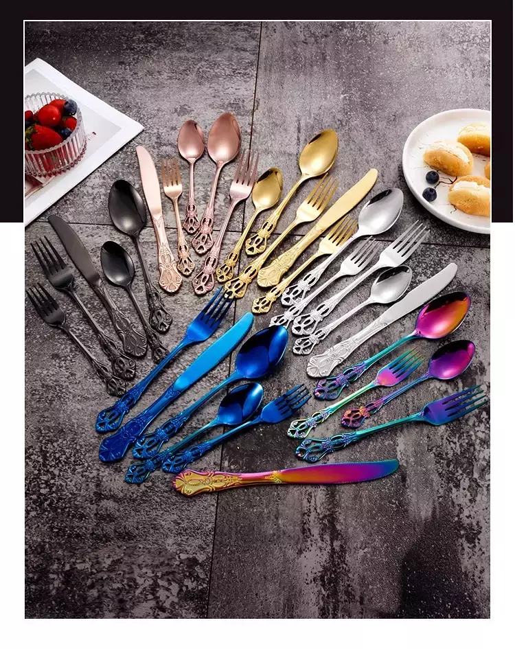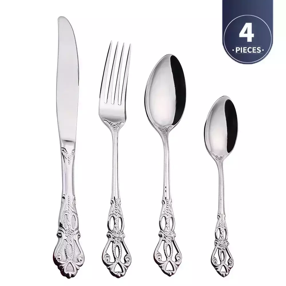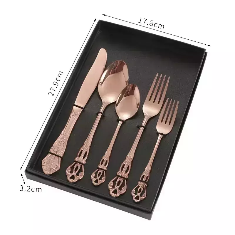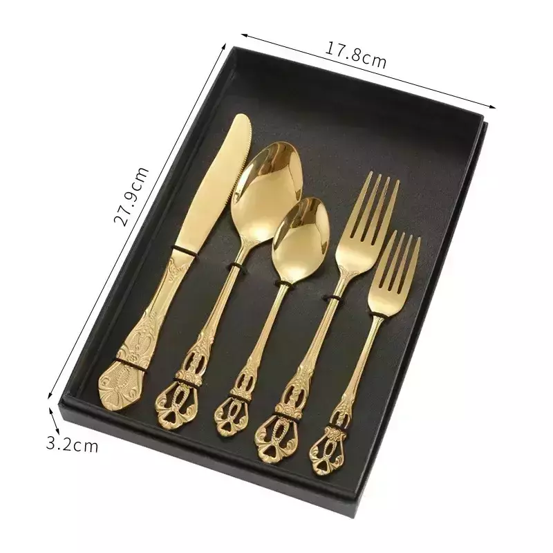 Juego de cubiertos dorados Retro, vajilla completa de lujo, cuchara de acero inoxidable de estilo europeo, tenedor, cuchillo para bistec, vajilla, caja de regaloJuego de vajilla retro de relieve hueco, añade un toque de elegancia a la mesa del comedor.