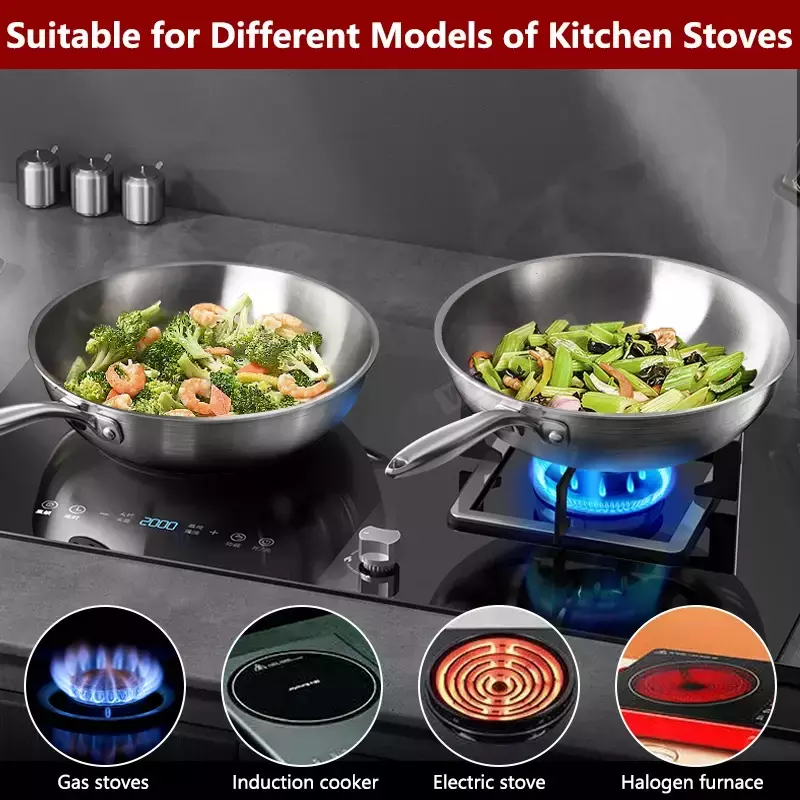?Buena distribución del calor?Fabricada con acero inoxidable revestido de tres capas de alta calidad con excelente conducción del calor y calentamiento uniforme, la sartén de acero inoxidable también ayuda en la distribución del calor, menos tiempo de cocción y los alimentos queman mucho menos.