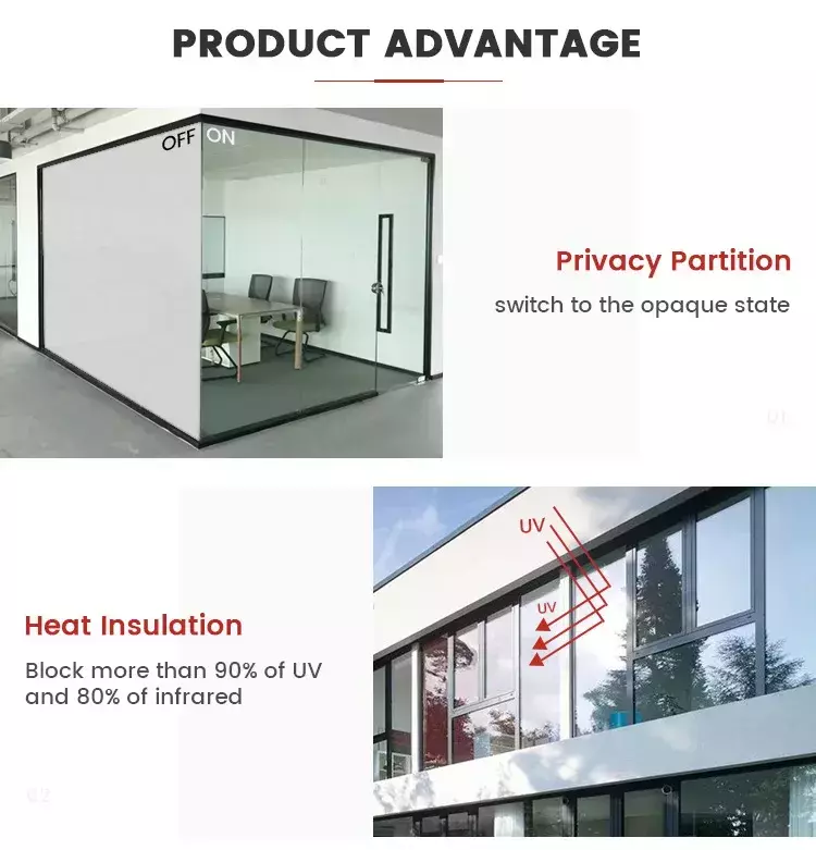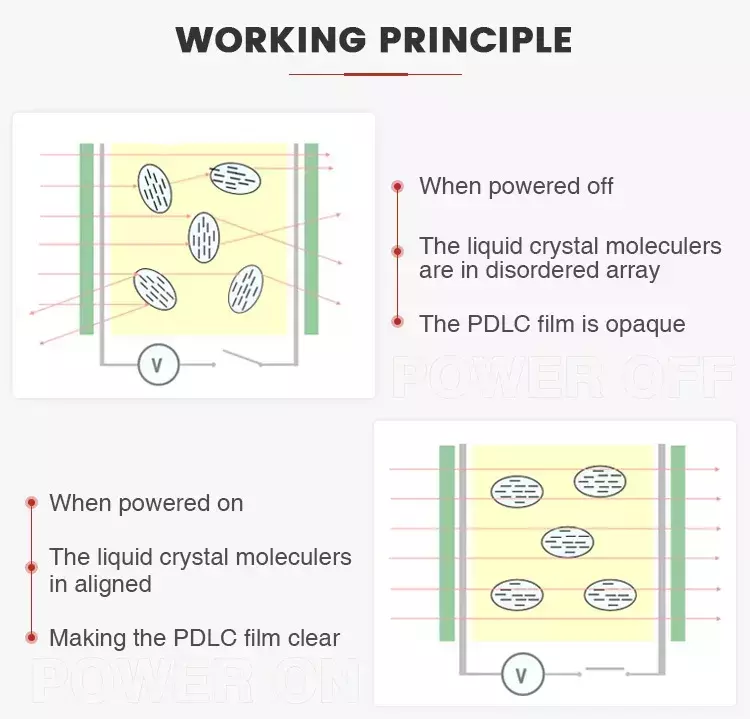 A: En el "estado apagado", cuando no se aplica energía a la película inteligente, la luz se absorbe o dispersa y la película parece gris oscuro o blanca.En el "estado abierto", se transmite la luz y la película parece transparente.