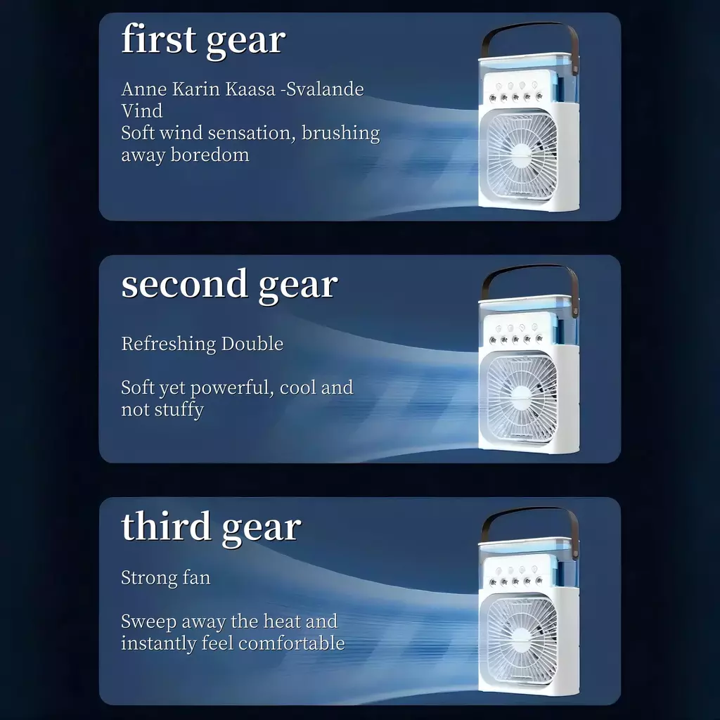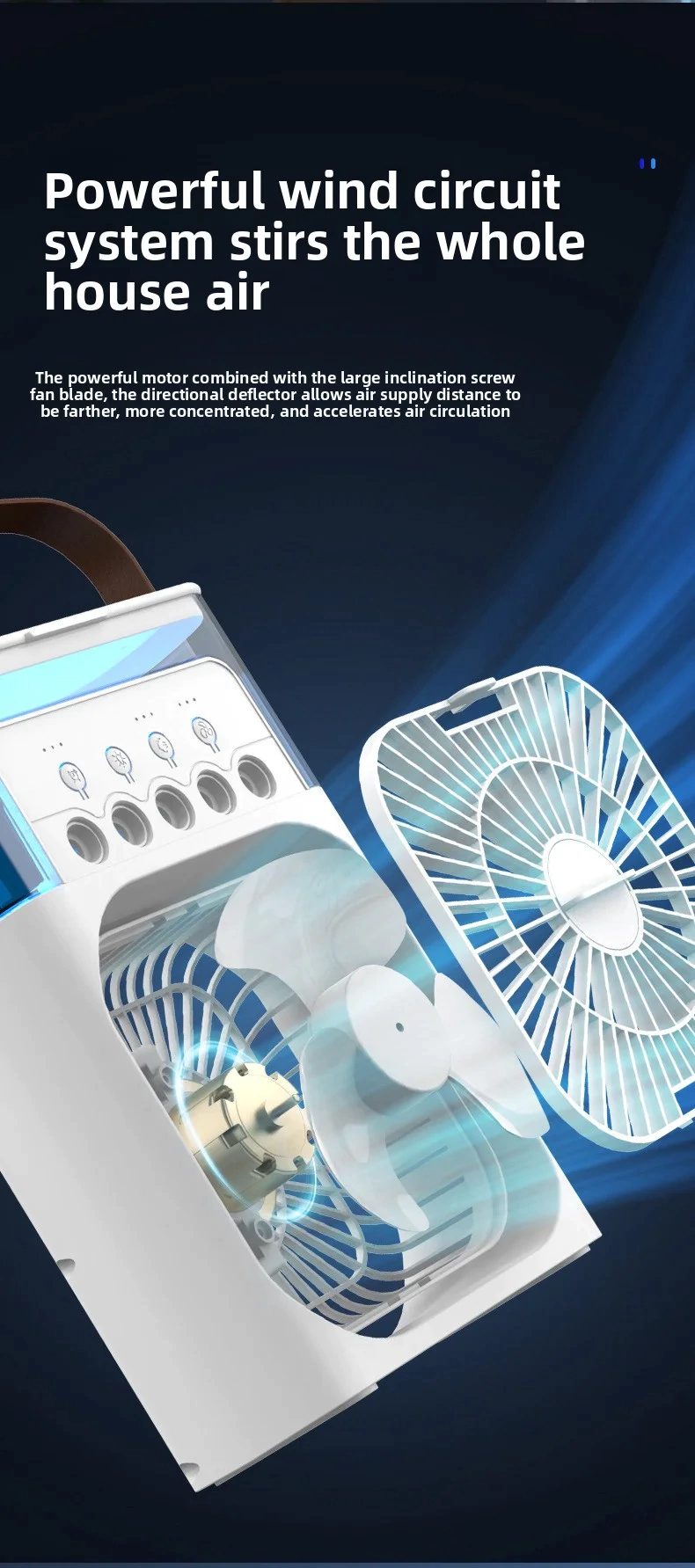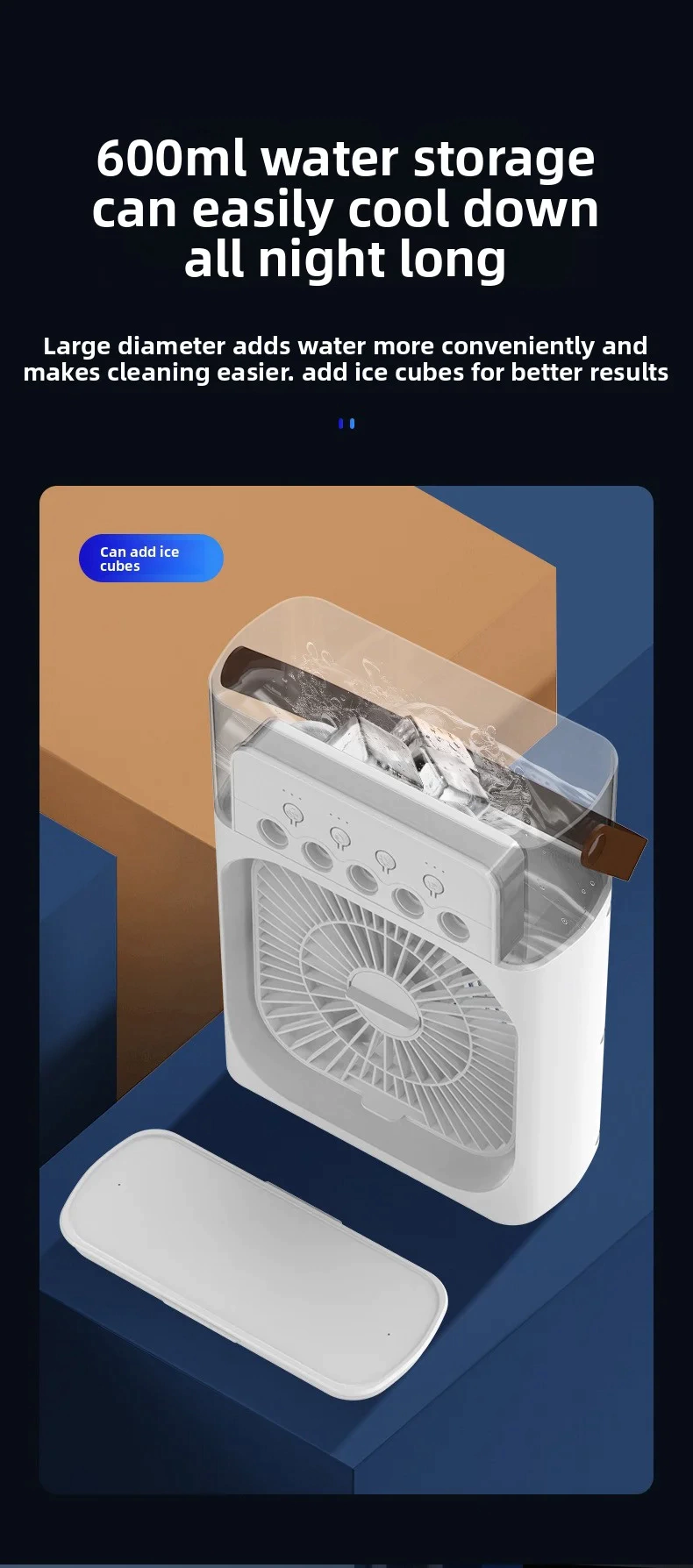 * 7 COLORES Y BAJO RUIDO: Este ventilador enfriador de aire portátil utiliza un diseño de luz de 7 colores para proporcionar una iluminación suave.Encendido* FUNCIÓN 3 EN 1: Contiene las funciones de ventilador, aire acondicionado y humidificador de aire.Si sientes que el aire está muy seco y caliente, cómpralo.No es sólo un enfriador de aire personal, sino también un humidificador de aire.En el caluroso verano, cuando agregas hielo y agua al fregadero, sentirás el aire fresco y disfrutarás del verano helado.Al mismo tiempo, en otoño e invierno, humedece el aire.