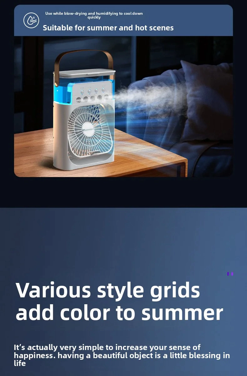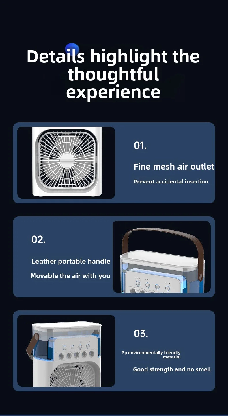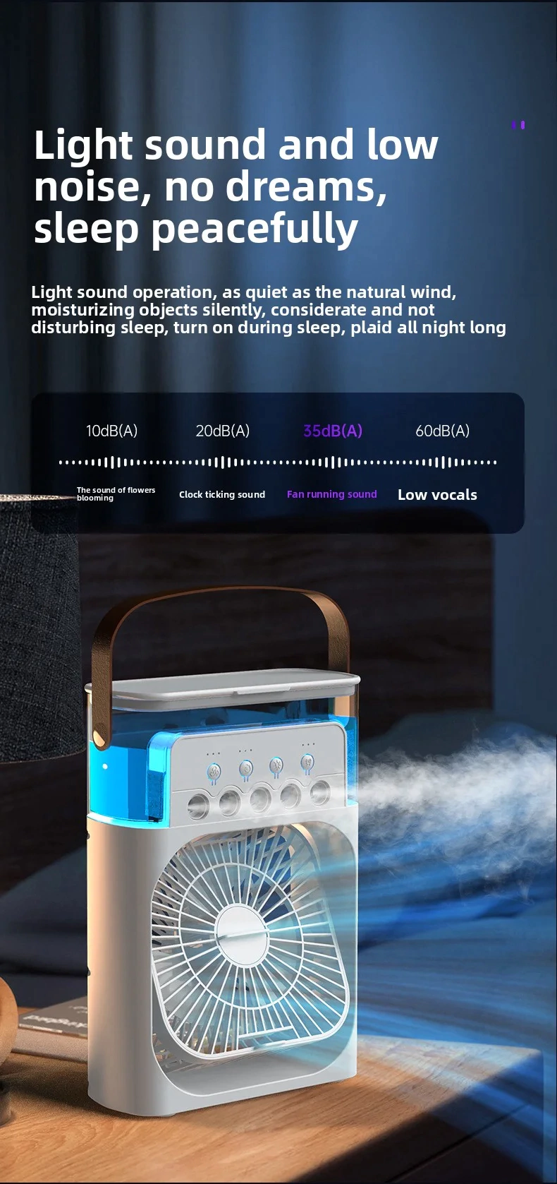 * 7 COLORES Y BAJO RUIDO: Este ventilador enfriador de aire portátil utiliza un diseño de luz de 7 colores para proporcionar una iluminación suave.Encendido* FUNCIÓN 3 EN 1: Contiene las funciones de ventilador, aire acondicionado y humidificador de aire.Si sientes que el aire está muy seco y caliente, cómpralo.No es sólo un enfriador de aire personal, sino también un humidificador de aire.En el caluroso verano, cuando agregas hielo y agua al fregadero, sentirás el aire fresco y disfrutarás del verano helado.Al mismo tiempo, en otoño e invierno, humedece el aire.