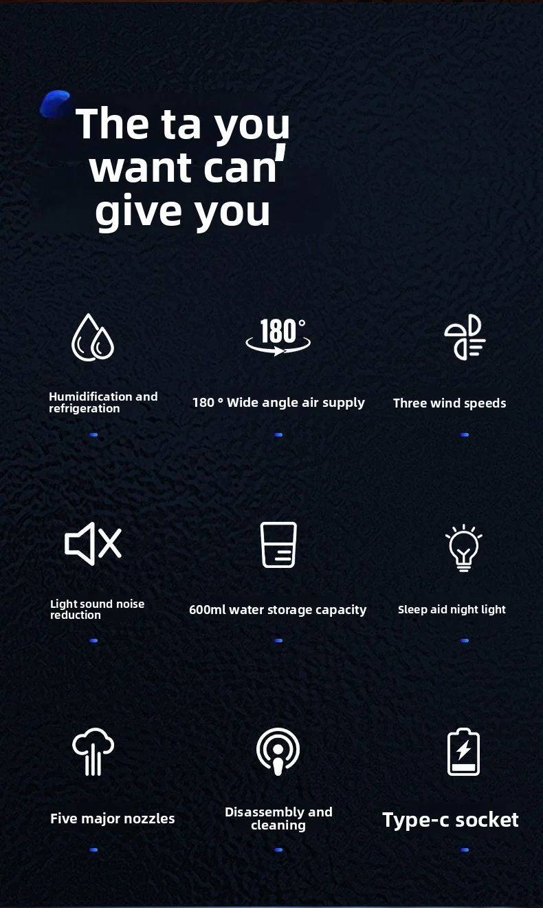 * 3 VINITOS Y 3 VELOCIDADES: El ventilador del enfriador de aire tiene 3 modos de velocidad del viento (baja/media/alta) y 3 modos de pulverización, puede ajustar la velocidad del viento y el modo de pulverización según la ocasión.Es una combinación de enfriador de aire acondicionado personal, ventilador, humidificador de aire y diseño multifuncional 3 en 1 para mantenerte alejado del caluroso verano y disfrutar del fresco verano.¡7 luces de colores en una calurosa noche de verano y colóquelas sobre la mesa del comedor o la mesa de café para crear un ambiente romántico!Ponlo en el dormitorio y te acompañará en la hermosa noche.Este ventilador enfriador de aire puede funcionar potentemente con poco ruido, lo que le permite dormir cómodamente durante la noche en un ambiente tranquilo.