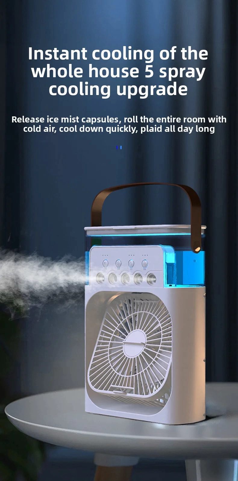 * DISEÑO PORTÁTIL Y GRAN CAPACIDAD: El ventilador enfriador de aire de diseño portátil se puede transportar fácilmente a cualquier lugar. En verano, esta es la mejor opción para acampar, puede acampar fácilmente, muy adecuada para familiares, oficinas, picnic al aire libre, etc. El tanque de agua grande de 600 ML está lleno de hielo y agua, puede rociar